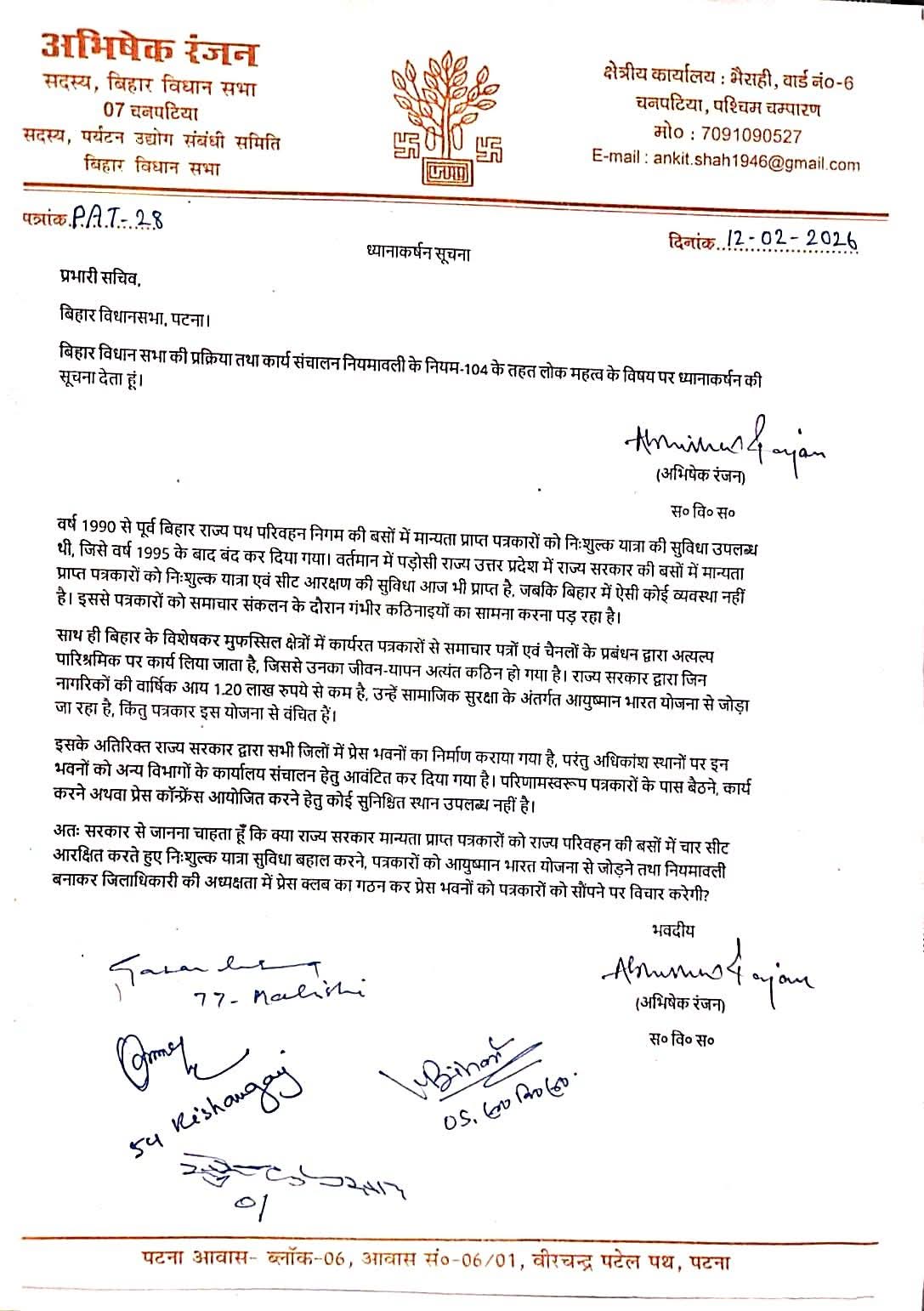 बेतिया:_बिहार विधानसभा में आज लोकतंत्र के चौथे स्तंभ की आवाज़ बुलंद हुई। चनपटिया के विधायक अभिषेक रंजन ने ध्यानाकर्षण सूचना के माध्यम से पत्रकार साथियों के हितों से जुड़े गंभीर मुद्दों को सदन में उठाया।